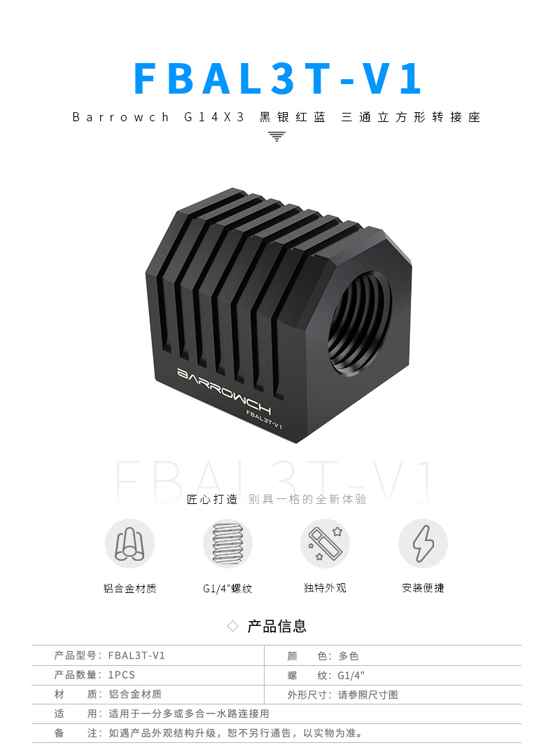 Barrowch G1/4"X3 黑/银/红/蓝 三通立方形转接座 FBAL3T-V1