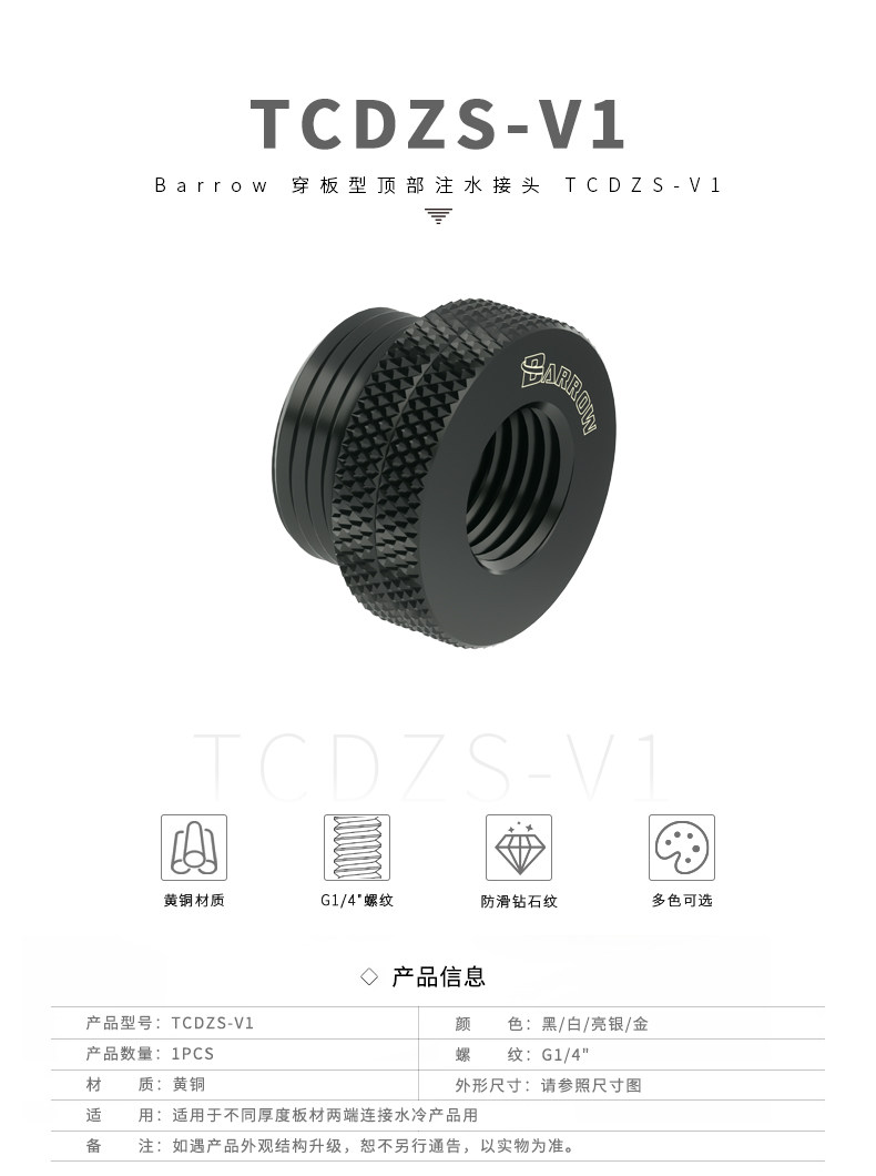 Barrow G1/4" 黑/亮银/白/金 穿板型顶部注水接头 TCDZS-V1