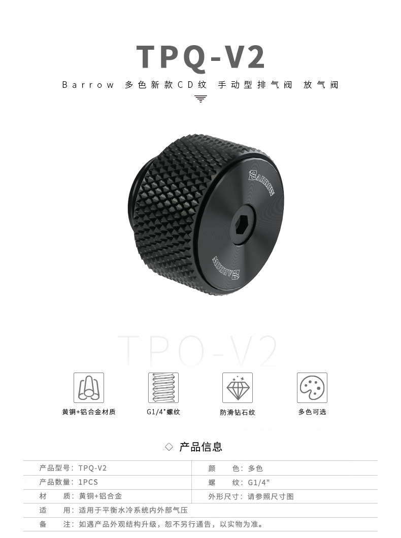 Barrow G1/4" 黑 多色新款CD纹 手动型排气阀 放气阀 TPQ-V2