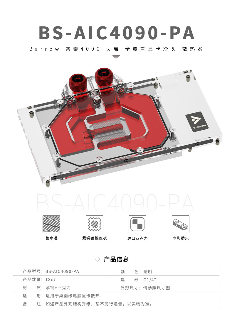 Barrow 索泰天启 4090 全覆盖显卡水冷头 散热器 BS-AIC4090-PA