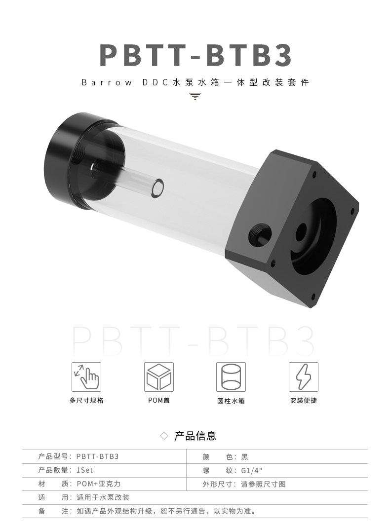 Barrow 黑色配透管4款长度可选 DDC泵箱一体套装 PBTT-BTB3系列
