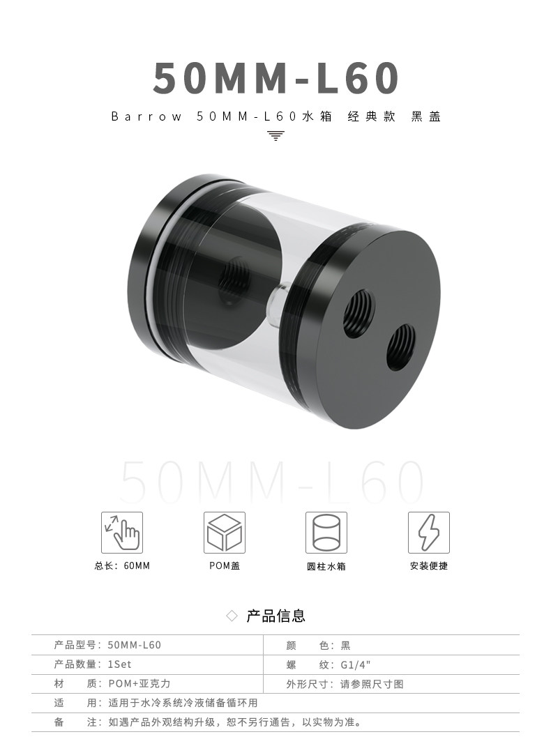 Barrow 50直径 圆柱型水冷散热水箱 50MM-L60