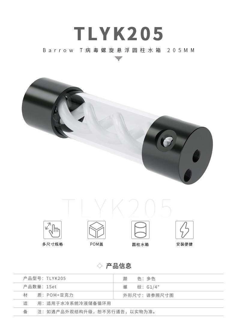 BARROW T病毒水冷圆柱螺旋悬浮水箱 205mm 侧孔/顶孔 TLYK-205