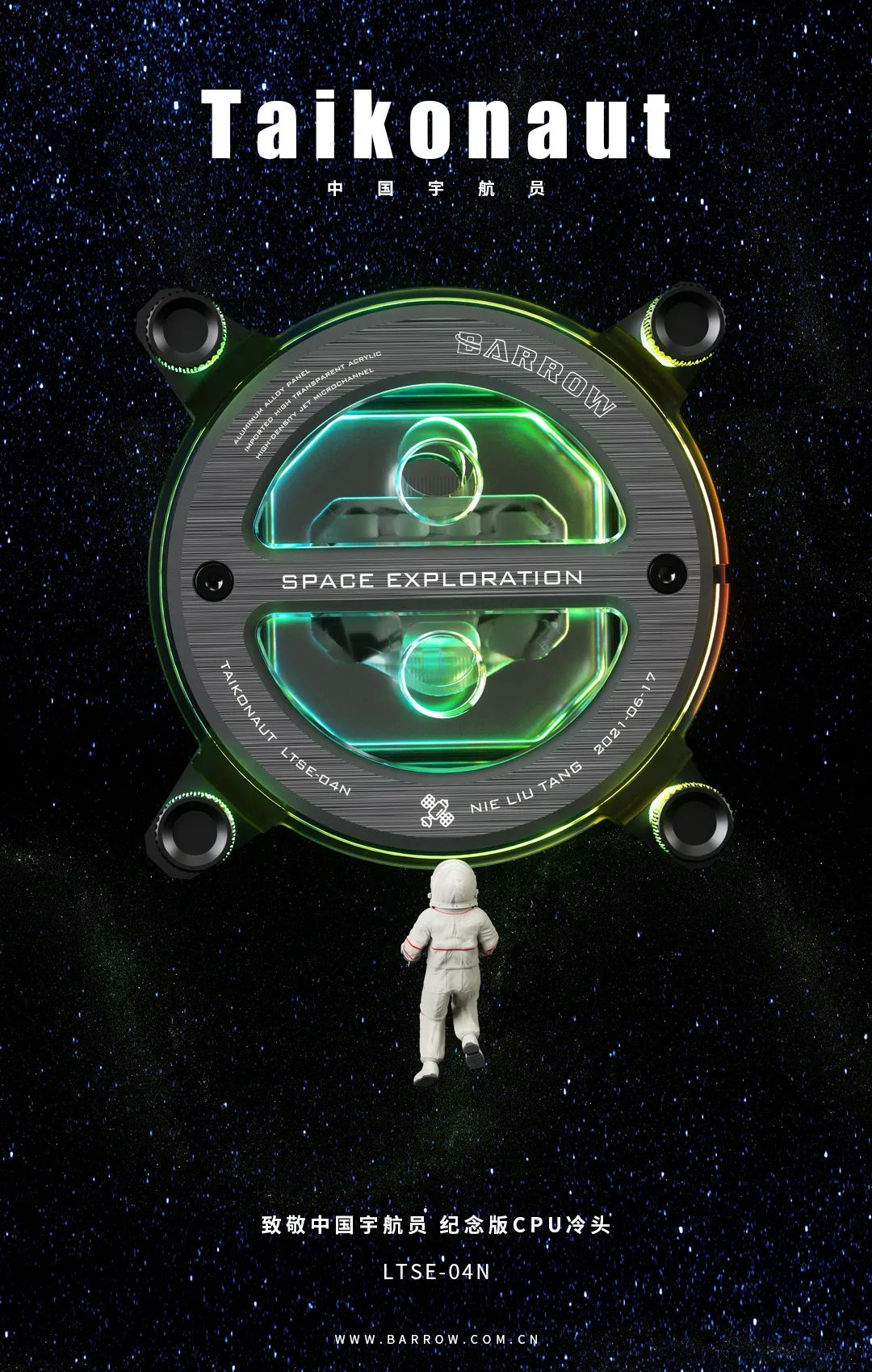 同时,BARROW推出中国宇航员纪念版CPU冷头--LTSE-04N,致敬人类在太空探索所做出的贡献以及纪念中国航天事业取得的里程碑式的成果。