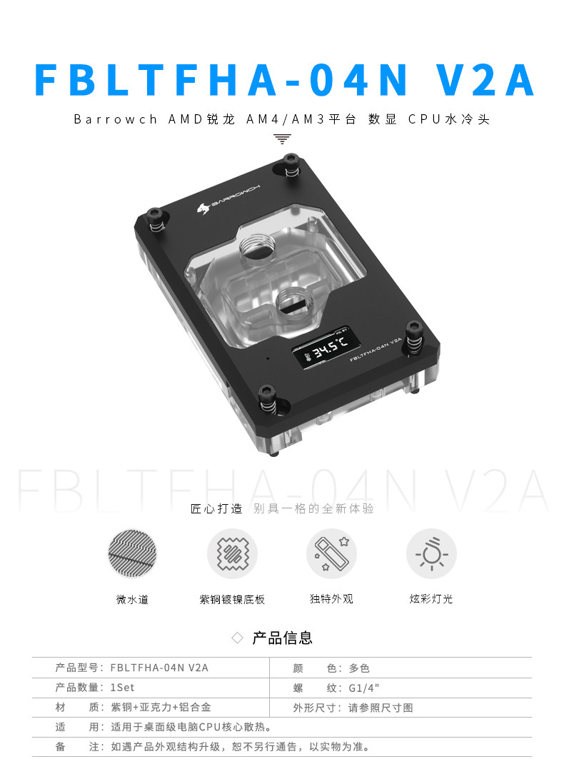 Barrowch AMD AM4/AM3+平台TFT数显 CPU水冷头 FBLTFHA-04N V2A