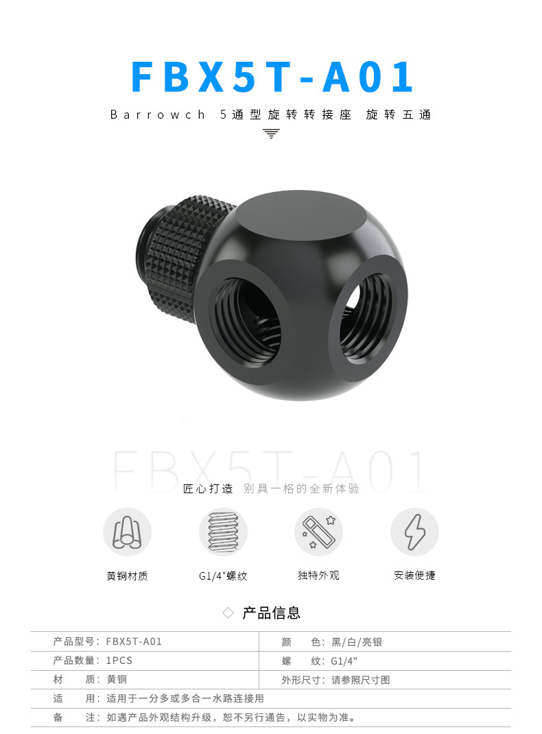 Barrowch G1/4"黑/亮银 5通型旋转转接座 旋转五通 FBX5T-A01