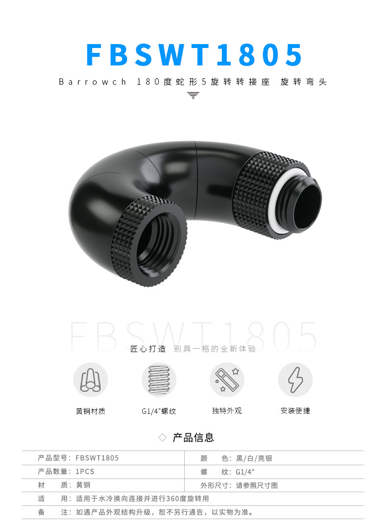 Barrowch G1/4"黑/银/白180度蛇形5旋转转接座 旋转弯头FBSWT1805