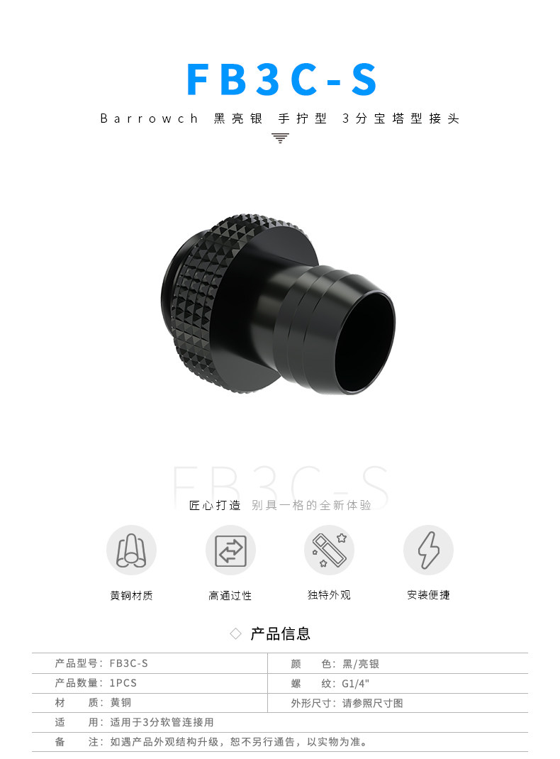 Barrowch G1/4" 黑/亮银/白 手拧型 3分宝塔型接头 FB3C-S