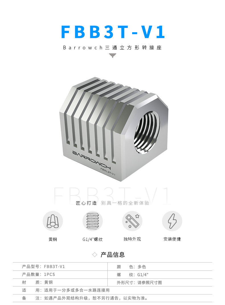 Barrow G1/4"X4 黑/亮银/白 四通立方型转接座 TLFT4T-A01