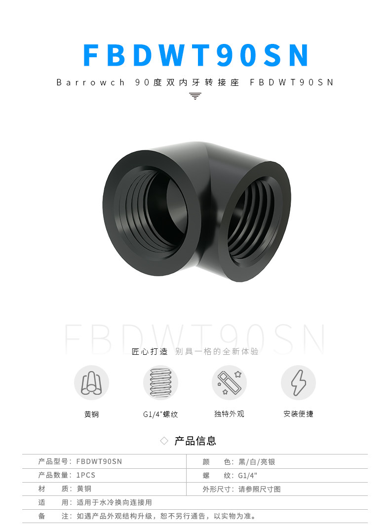 Barrowch G1/4" 黑/亮银/白 90度双内牙转接座 FBDWT90SN