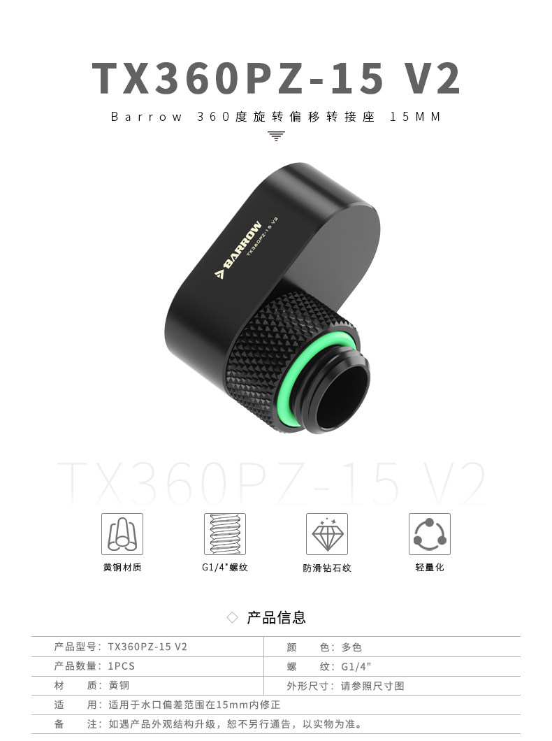 Barrow G1/4" 360度旋转偏移转接座 15MM TX360PZ-15 V2
