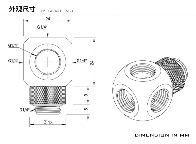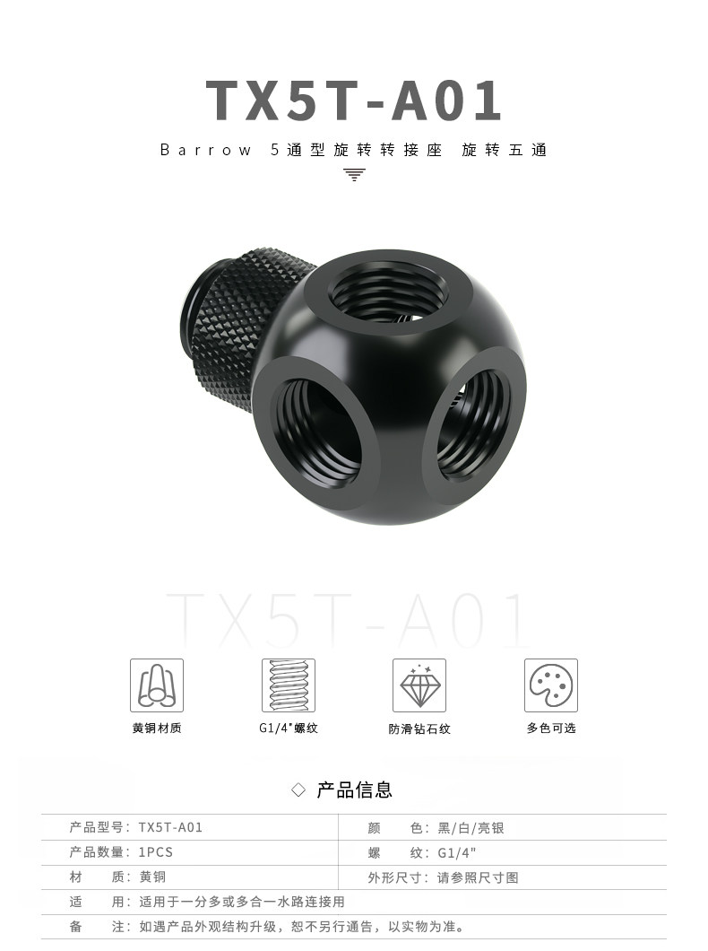 Barrow G1/4" 黑/亮银/白 5通型旋转转接座 旋转五通 TX5T-A01