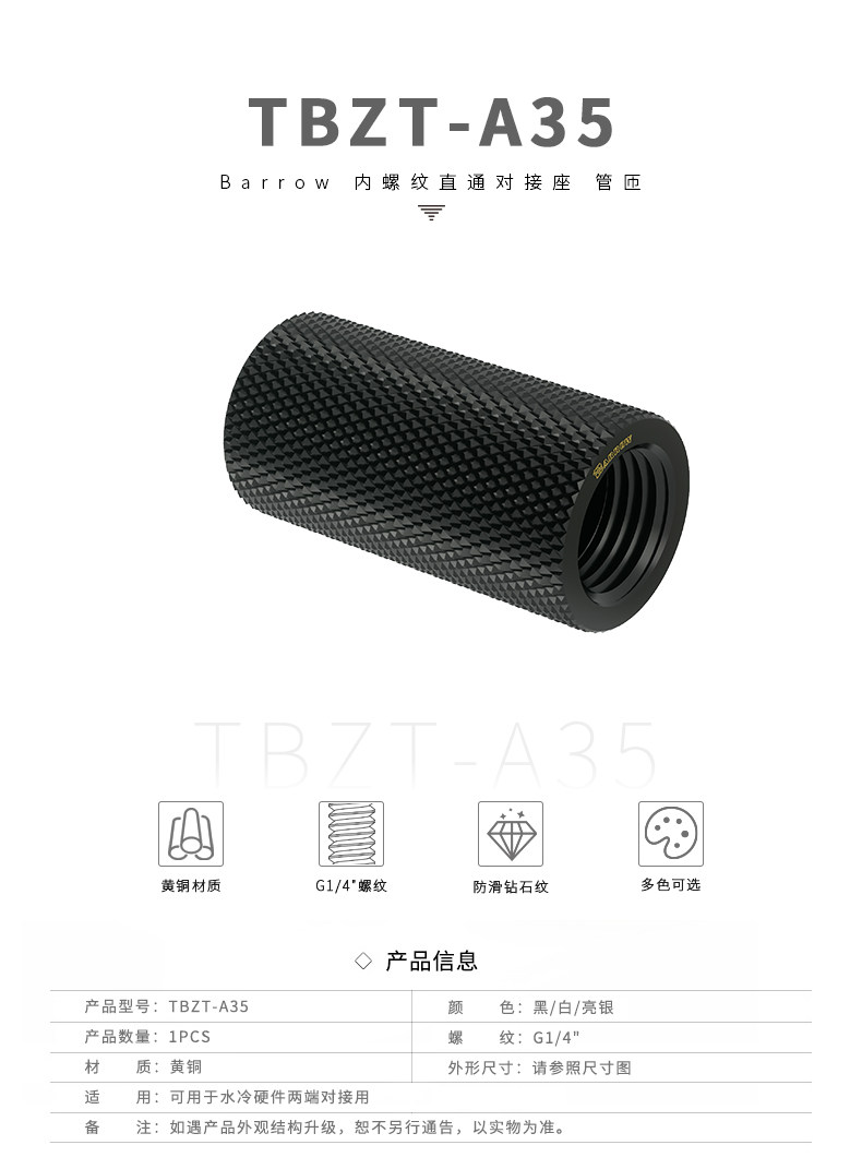 Barrow G1/4" 黑/亮银/白 内螺纹直通对接座 管匝 TBZT-A35