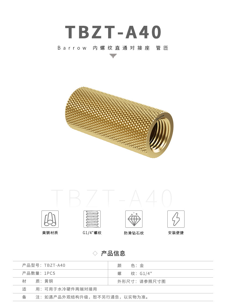 Barrow G1/4" 黑/亮银/白/金 内螺纹直通对接座 管匝 TBZT-A40
