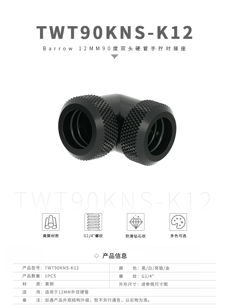 Barrow 黑/亮银/白/金 12MM90度双头硬管手拧对接座 TWT90KNS-K12