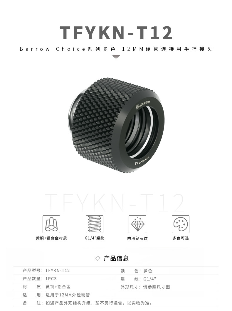 Barrow Choice系列 12MM硬管连接用手拧接头 彩色硬快TFYKN-T12