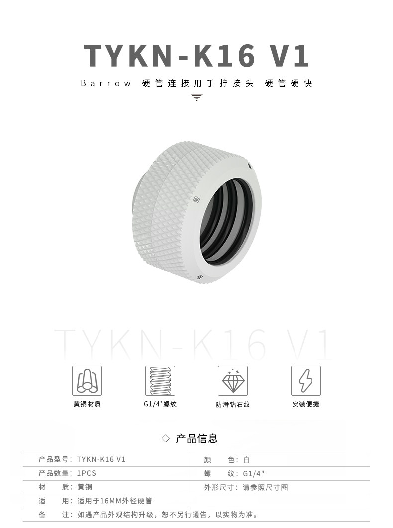 Barrow 黑/亮银/白/金 硬管连接用手拧接头 硬管硬快 TYKN-K16 V1