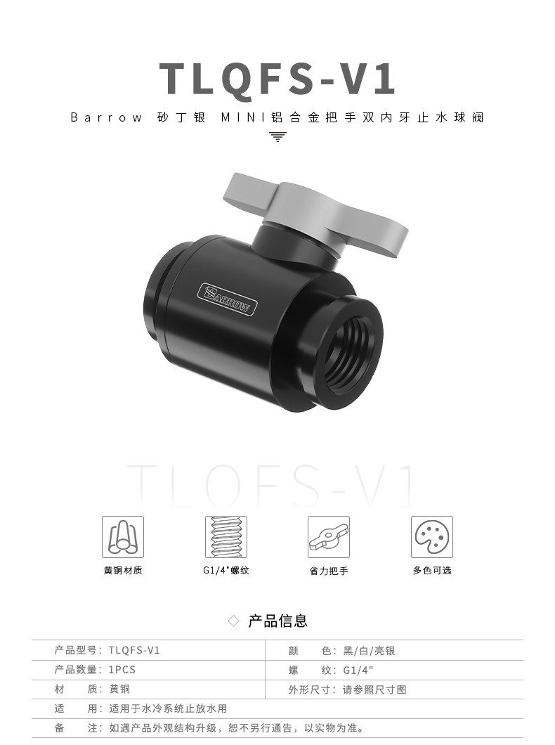 Barrow G1/4" 砂丁银 MINI铝合金把手双内牙止水球阀 TLQFS-V1