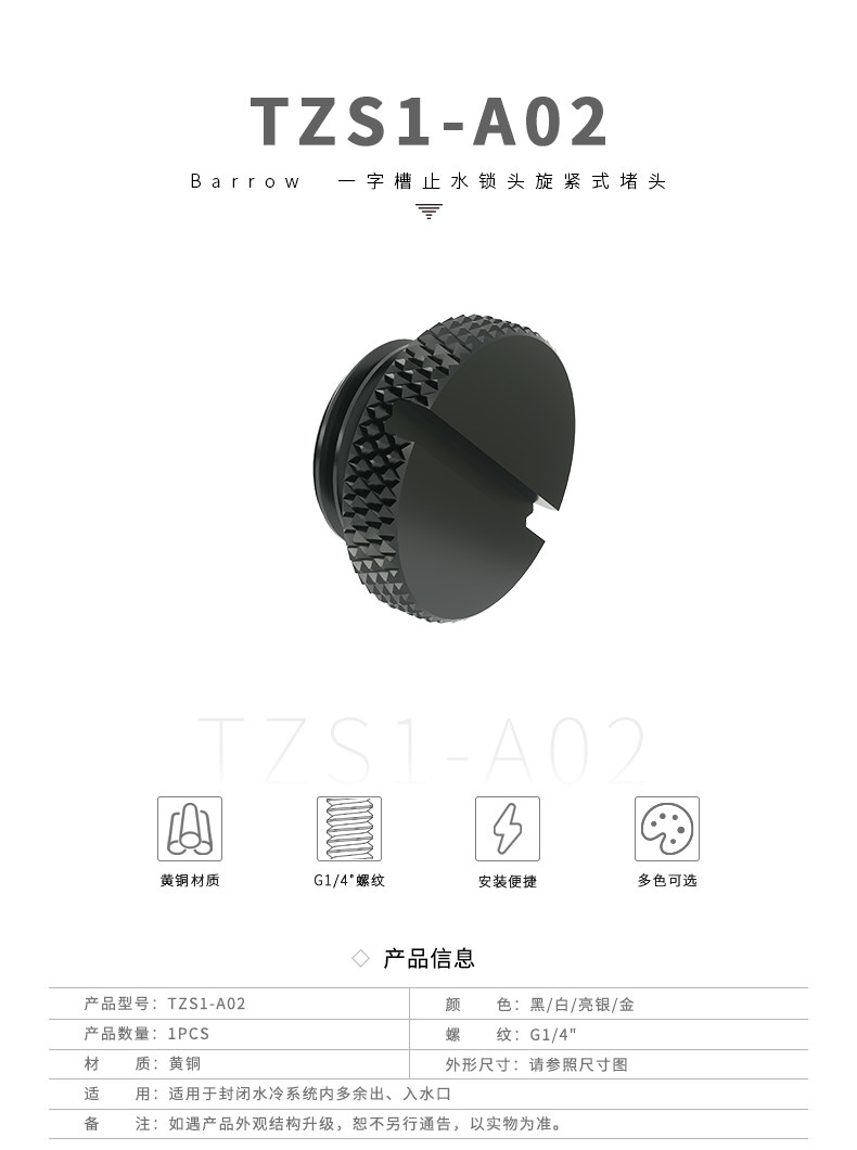 Barrow G1/4" 黑/银/白 一字槽止水锁头硬币旋紧式堵头TZS1-A02