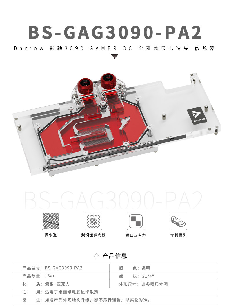 Barrow 影驰3090 GAMER OC全覆盖显卡冷头 散热器 BS-GAG3090-PA2