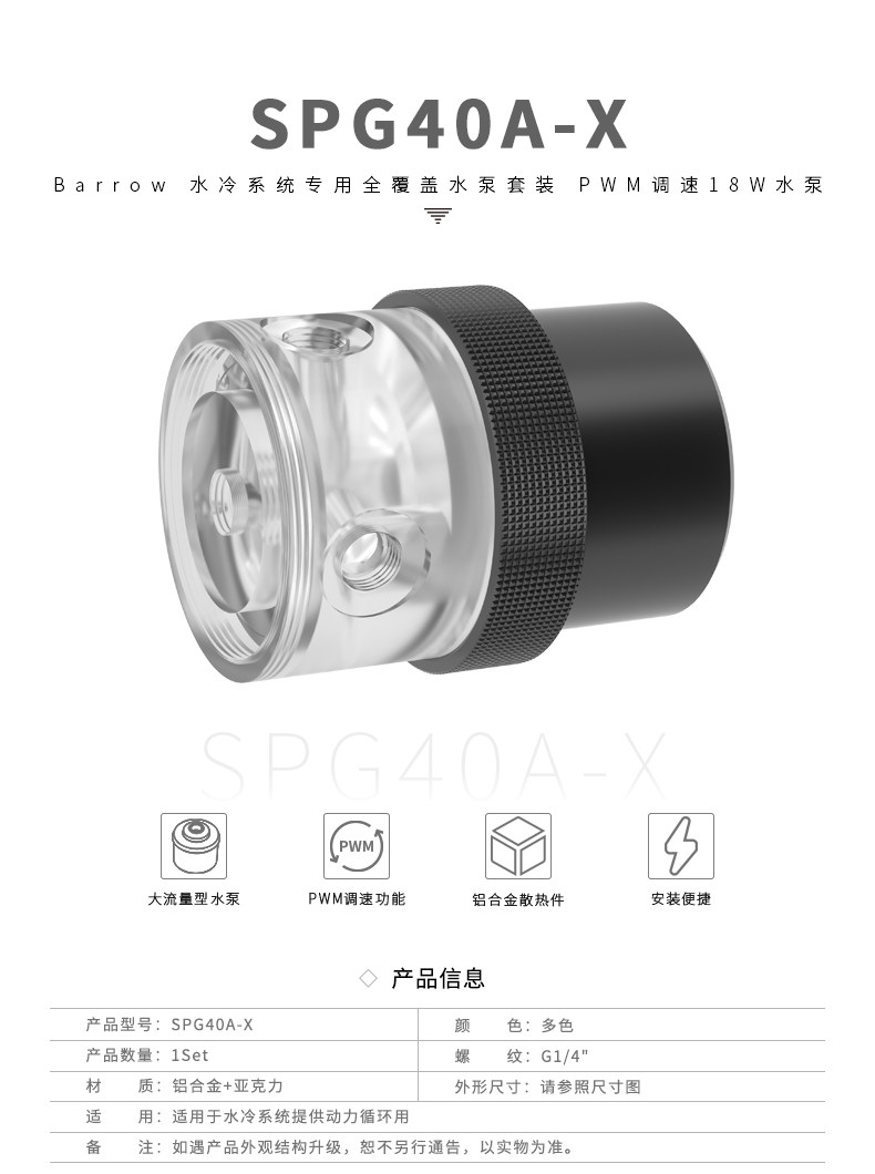 Barrow透明 水冷系统专用全覆盖水泵套装PWM调速18W水泵SPG40A-X